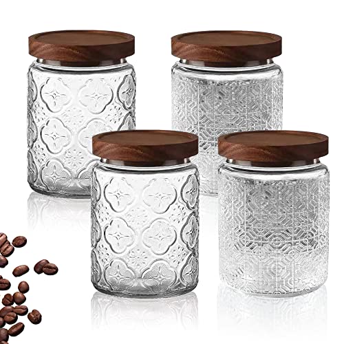 Glasburk med lock, 4 st lufttätt glas matförvaringsbehållare set, fyrkantiga klara glasburkar bred mun matförvaringsbehållare med trälock för socker kaffebönor te krydda havre mellanmål (700 ml)