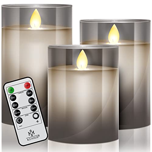 KESSER® LED-Ljus, set om 3 flamlösa ljus med fjärrkontroll, timerfunktion, timer, dimmer äkta vaxljus, 10 cm, 12,5 cm, 15 cm hög, realistisk, flimrande ljus, LED-lågor, glasdekoration