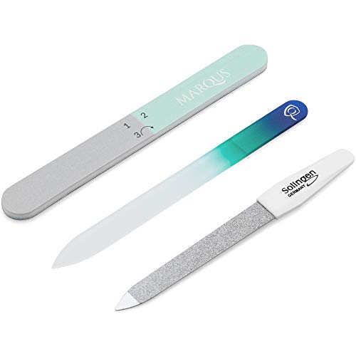 Manicare 3 nagelfilar i glas, för att forma och styla naglar, stark glasfil för naturliga och konstgjorda naglar, dubbelsidiga, inkluderar skyddsfodral, perfekt för hemmet eller på språng manikyr