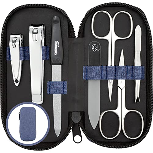 marQus manikyrset för damer och herrar Solingen Tillverkat i Tyskland 7 delar med patenterad glasfil för hand- och fotvård - fodral i läderimitation i jeanslook