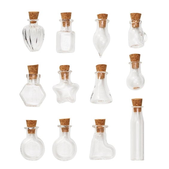 Mix med glasflaskor vialer med kork 12 st. i varierande storlekar