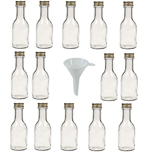 Viva Haushaltswaren – 14 x tomma glasflaskor 100 ml med guldfärgad skruvlock, kan användas som små spritflaskor och likörflaskor (inklusive tratt Ø 5 cm)