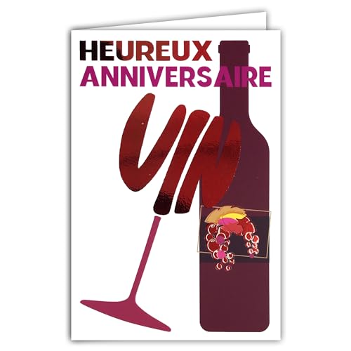 69-9014 Happy Birthday-kort + kuvert 12 x 17,5 cm ord glänsande rött vin silhuett glasform ballong och flaska drickande hälsoutskrift - skapelse tryckt fransk tillverkning