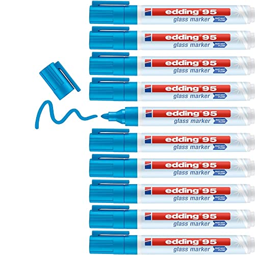 edding 95 glasmarkör - ljusblå- 10 glaspennor - rund spets 1,5-3 mm - tvättbar fönstermarkörpenna - för att skriva och markera på glasytor, fönster, glasskivor, whiteboards - torkbar