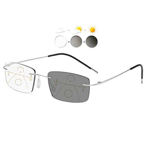 KOOSUFA kantlösa självtonande glidande läsglasögon glidande glasögon progressiva multifokus anti-blått ljus fotokrom män kvinnor titan med UV-skydd solglasögon 1,0 1,5 2,0 2,5 3,0 3,5, 1x silver, 2.5