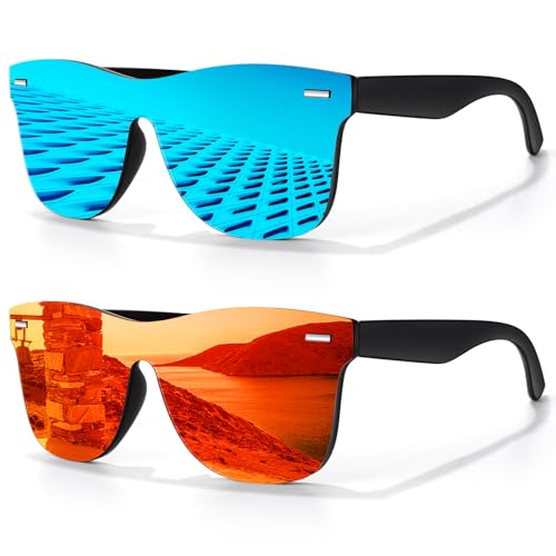 LINVO Solglasögon, män, kvinnor, polariserade, klassiska, speglade, moderiktiga, UV400 skydd, unisex glasögon för bilkörning, resor, (2-pack) Svart | Blå + svart | Orange, Medium