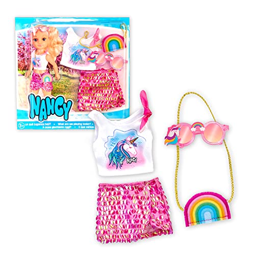 Nancy En dag med enhörningslook, mode dockklädeset med tillbehör och kläder, T-shirt, rosa kjol, regnbågsformad väska och reflekterande glasögon, 3 år berömda (NAC27000)