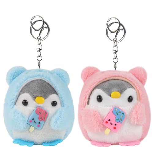 ANBOOR 2-pack små mjuka leksaker, pingvin, plyschdjur, med nyckelring, utmärkelse, gästgåva, fyllningar, glass, pingvin, plyschdjur, leksak, festgåvor, jul (blå, rosa)