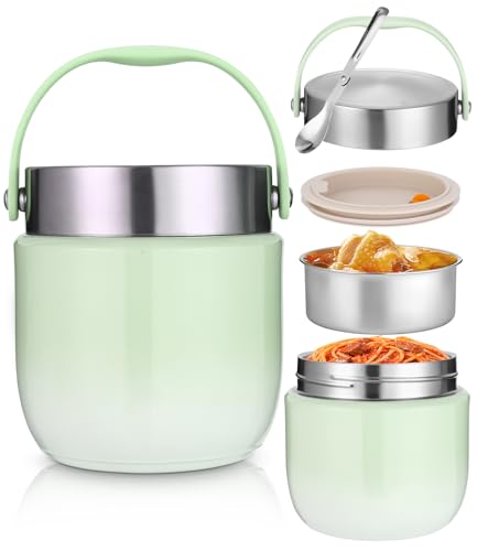 Termosbehållare för mat 1 200 ml, termoskål med lock, varmhållningsbehållare i rostfritt stål med vikbar sked, matlåda termo barn vuxna för förvaring av soppor, gröt, glass, grön