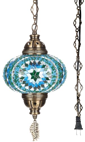 DEMMEX Plug-in Turkish Moroccan Mosaic Hanging Pendant Ceiling Light – Swag Lamp Fixture with 15ft Cord & Chain, Handcrafted Glass, Tiffany Style, Mediterranean Decor (Turquoise)