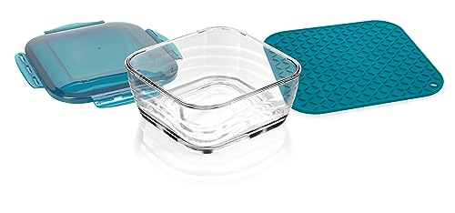 Genius Nicer Dicer Chef Professional färskhållningslåda glasskål med lock | Uppsättning av 3 delar Tillbehör, 2,8 l kapacitet, inkl. silikonmatta, halkfri matta, ugnsfast