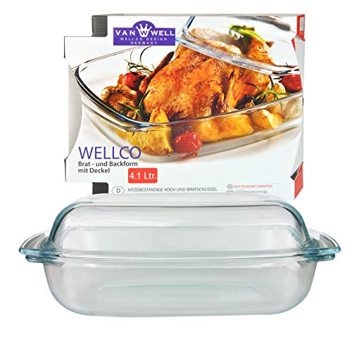 Van Well Stek- och bakfat 4,1 l med lock, 340 x 215 mm, glasskål 2,5 l + lock 1,6 l, rektangulär gryta tallrik, Wellco köksredskap, brandsäker skål
