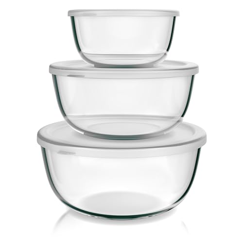 Arendo - Salladsskål av glas med lock, glasskål, set om 3, 1 100 ml + 2 700 ml + 4 400 ml – blandningsskålar små till stora – borosilikatglas – glasskål, salladsglasskål