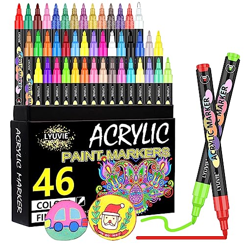 Lyuvie Akrylfärgpennor, 46 färger akrylpennor för sten målning tyg glasstenar sten metall trä keramik, vattenbaserade permanenta färgpennor markörer med 0,7 mm extra fin spets