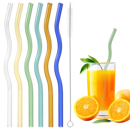 6 stycken sugrör glas glassugrör kort sugrör vågiga färgglada glassugrör återanvändbara glassugrör set glas sugrör med 1 rengöringsborste för drycker kaffe juice cocktails