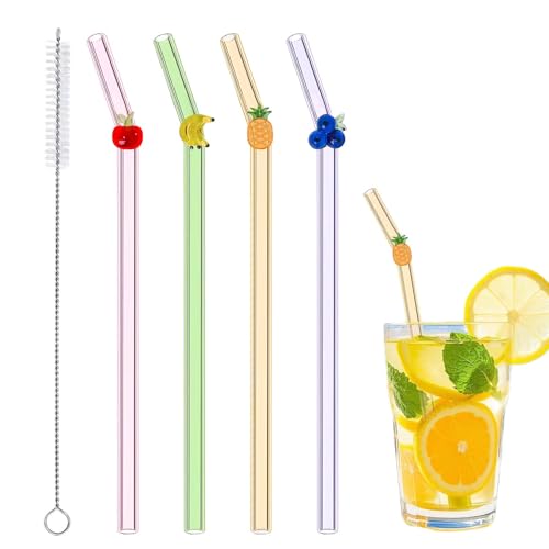 4 st glassugrör med 1 rengöringsborstar, söta färgglada fruktsugrör okrossbara, återanvändbara sugrör diskmaskinssäkra för presenter fruktälskare, juice, sommarstrand, födelsedagsfest