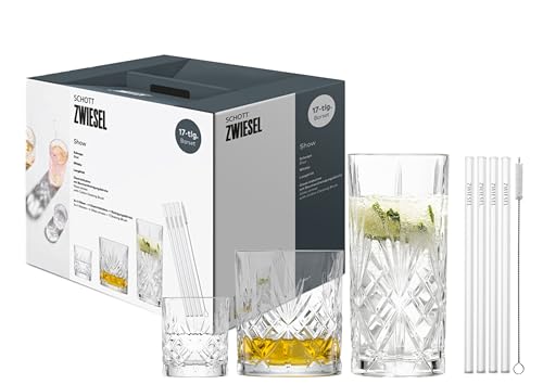 SCHOTT Two 17 barset show, 4 graciösa långdrink-, whisky- och snapsglas med relieff, 4 glassugrör och 1 bomullsborste, diskmaskinssäkra kristallglas (art.nr 124010)
