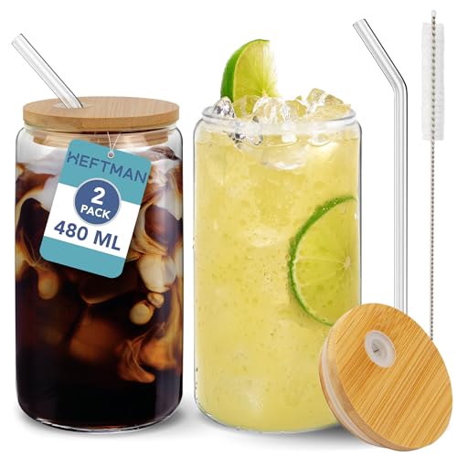HEFTMAN Glaskoppar med lock och sugrör – 2-pack tomma 480 ml burkformade glasögon med lufttäta bambulock, glassugrör och rengöringsborste för sugrör – istat kaffeglas för smoothies, öl, fester,