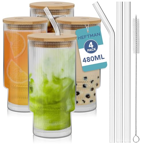 HEFTMAN Ribbade glas, 480 ml – 4 st stapelbara glaskoppar med bambulock och glassugrör set med 2 rengöringsborstar