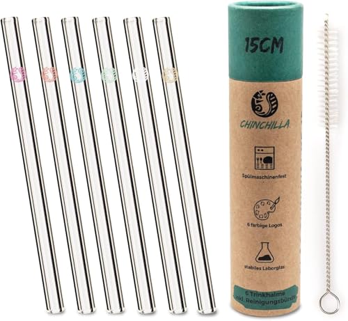 HALM Glas Sugrör Återanvändbara Drickrör - 6 stycken korta raka 10 cm + plastfri rengöringsborste - Diskmaskinssäkra - Hållbara - Glassugrör för Shot-glas