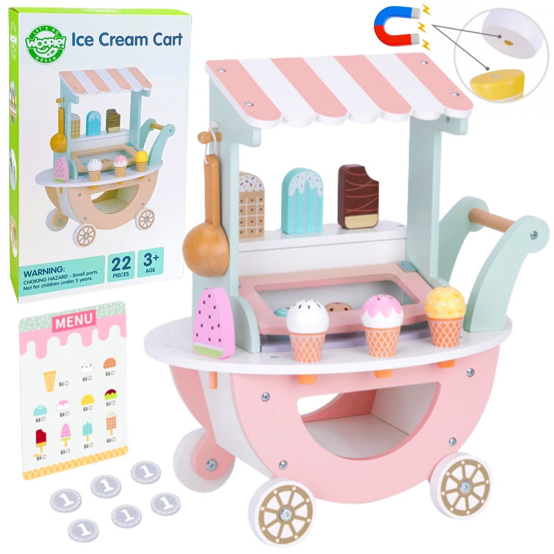 Mamabrum Träglassaffär på hjul för barn 3+, Mobil Glassvagn, Leverantörslek, Diskret Design, Rika Tillbehör, Utveckla Kreativitet och Social Färdigheter