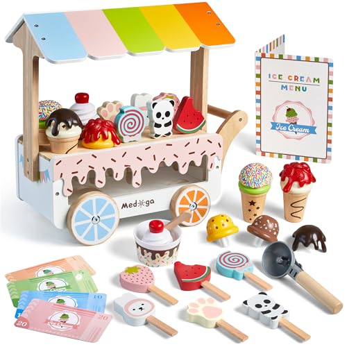 Glassvagn i trä leksak lekset med glassleksaker låtsaslek mat lastbil lek kökstillbehör med isLolly & Scoop & Meny träleksaker present till 3, 4, 5, 6, 7, 8 år gamla flickor pojkar