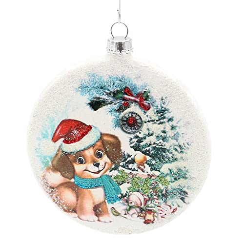 Dekohelden24 Lauschaer Julgransdekoration-glastallrik tryckt med liten hund och julmössa, med glitterdekor och silverkrona, storlek B/Ø: ca 1 x 9 cm, 9 cm