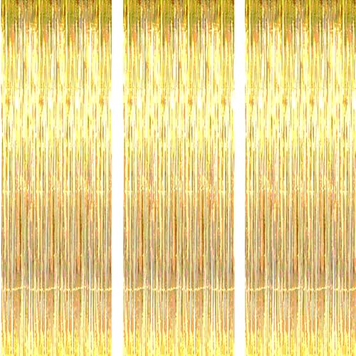 O-Kinee Guldglittergardiner, guldfolie gardiner, 3-pack, 2,5 m folie fransgardin, metallisk glitter gardin för festdekoration, födelsedag, ramadan, baby shower, bröllopsfest dekoration