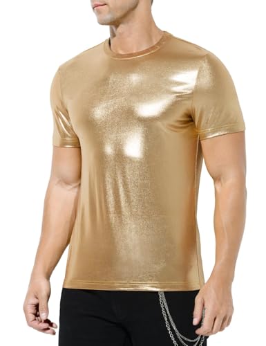 Casey Kevin herr metallic glänsande skjorta solid gyllene silverskjorta glitter nattklubb t-shirts 70-talet 80-talet disco bronzing party kostym, Guld, M