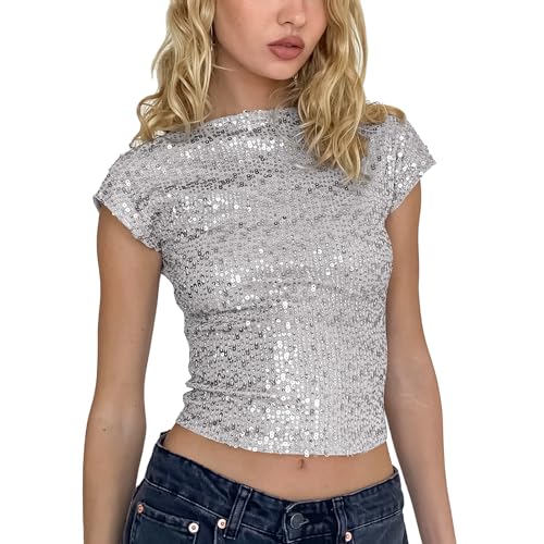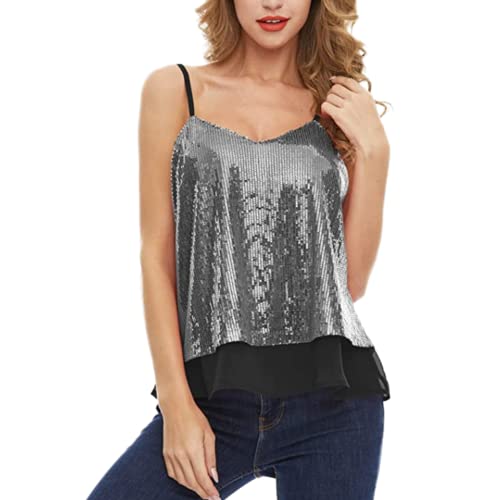 MLKLDOU Dam glitter paljett linne ärmlös ärmlös skimmer linne väst toppar kort mode smal t-shirt för kvinnor flicka, Silvrig, M