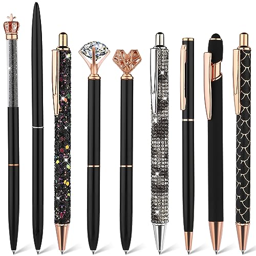 TIESOME 9 stycken söta kulspetspennor i set, lila fina pennor, bling, glitter, metallpenna för anteckningar, med svart bläck, infällbara pennor, present för kvinnor, flickor, brudtärna och bröllop