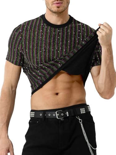 Mauro Kane T-shirt paljetter herr glitter t-shirt herr kortärmad glänsande tröja nattklubb danskläder, B1-regnbåge, XL