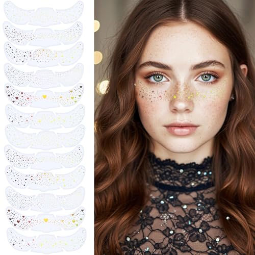 Calkkrer 12 stycken gyllene glitter fräknar tatuering, ansikte strass för make-up, tillfälliga gnistrande fräknar, lysande tatueringsklistermärken för karneval, fest