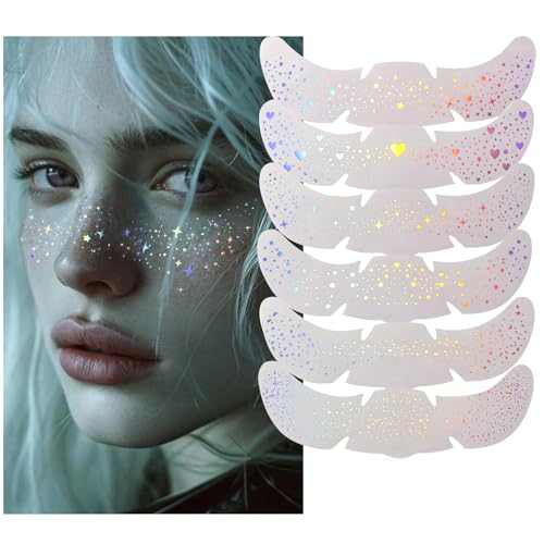 Calkkrer 6 st flerfärgad holografisk glitter tillfällig tatuering ansikts vattentäta klistermärken, lysande fräknar, stjärna glitter ansiktsplåster