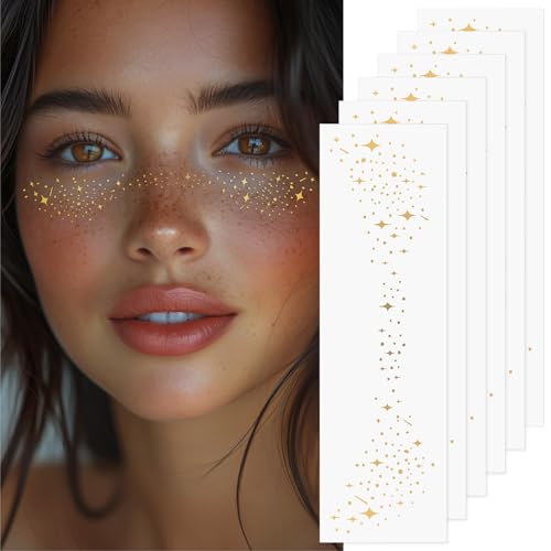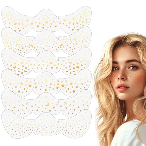 TELAIN 6 stilar glitter fräknar tatuering klistermärken, vattentäta metalliska konstgjorda fräknar lappar, gyllene glänsande sminktatueringar för festival, jul, fest
