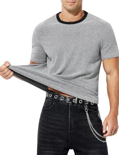 Mauro Kane glitter t-shirt män paljetter kortärmade toppar metallisk glänsande skjorta party toppar, B2 silverränder, XL