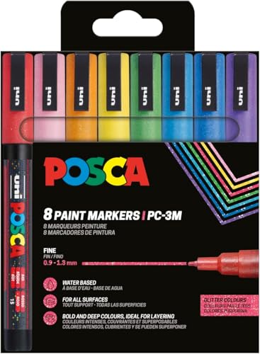 POSCA 186539 POSCA-märkpennor – 8 st akryl-glitterpennor PC-3M permanenta markörer – 0,9–1,3 mm rund spets