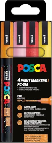 Uni-Ball 186530 POSCA-märkpennor – 4 st akryl-glitterpennor PC-3M permanent markörer – 0,9–1,3 mm rund spets