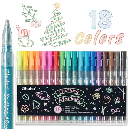 Ohuhu 18 konturpennor glitterpennor – dubbla linjer glittermarkörer roliga hantverk konsttillbehör för tonåringar vuxna gåva glitter skimmer effekt på vita papper för födelsedag gratulationskort glas