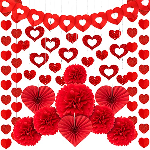 Whaline Alla hjärtans dag festdekorationssats, 1 rött hjärta ihåliga girlangbanderoll, 3 hjärtpappersfläktar, 4 glittrande hjärtsträngar dekor, 6 röda papperspompomer, 12 hängande hjärtvirvlar