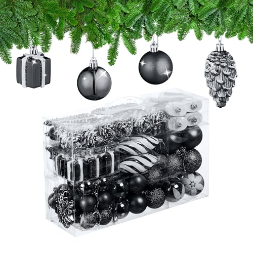 Relaxdays Set med 72 julgranskulor, glittrande julgranskulor, med glitter och matta, stövlar, hjärta, ananas, svart, 3 storlekar