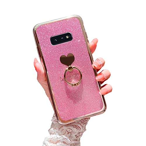 Fodral till Galaxy S10E (inte S10) flickor kvinnor söt lyxig glitter glänsande glittrande skal med ringstativ hjärta smal mjukt stötsäkert skyddande telefonfodral för Samsung Galaxy S10E – rosa