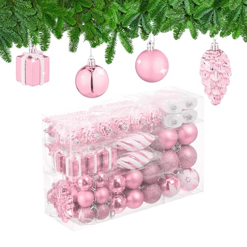 Relaxdays Set med 72 julgranskulor, glittrande julgranskulor, med glitter och matta, stövlar, hjärta, ananas, rosa, 3 storlekar