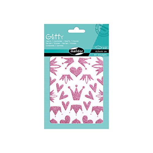 Maildor AE073O - Un sachet de gommettes Glitty 2 planches 10,5x16 cm, Cœurs et couronnes en rose (87 stickers)