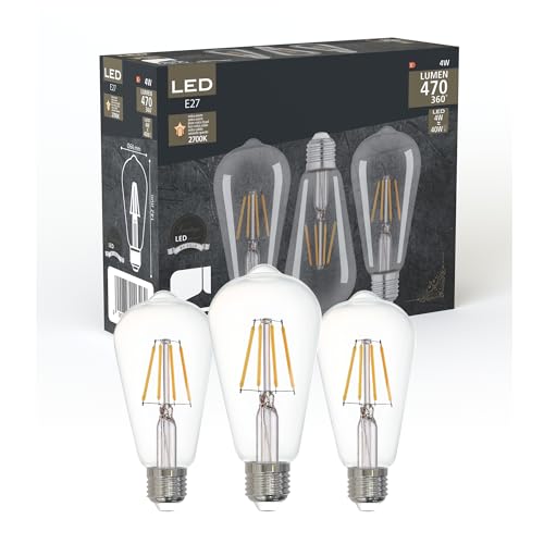 EGLO set om 3 LED-trådslampor med E27-sockel, Edison vintage glödlampor klara, 4 watt vardera, varmvit glödlampa, 2700 K, 470 lumen, retro glödlampa ST64, Ø 6,4 cm