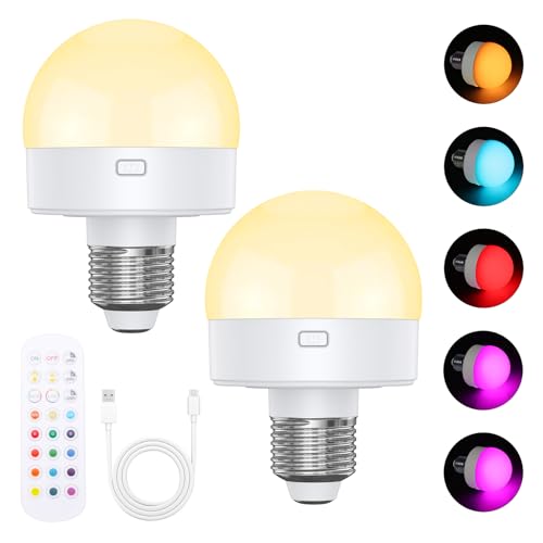 OQIMAX LED-glödlampa E27, RGB glödlampa med fjärrkontroll, 12 färger och 3 färgtemperaturer varmvit dimbara glödlampor, timerfunktion, USB-uppladdningsbar glödlampa för party deco, 2 stycken