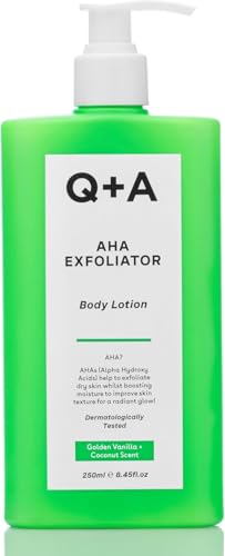 Q+A AHA Exfoliator Body Lotion (250 ml), exfolierande, utjämnande kroppsfuktkräm med mjölksyra, glykolsyra och frukt AHA, alternativ för kroppssmör, vegansk kroppsvård
