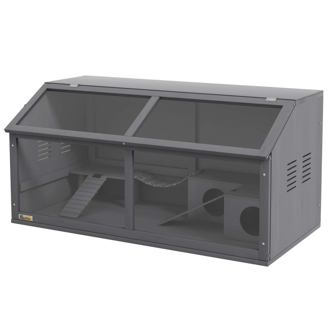 PawHut Hamsterbur i trä, 100 cm gnagarhus, bur för små djur, lekhus med hängande bro, stegar, öppningstak, stuga, mörkgrå