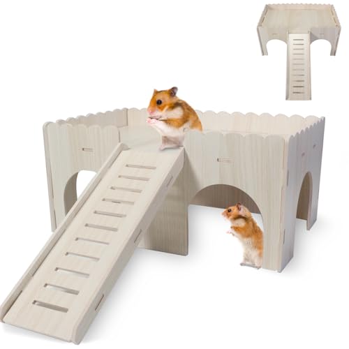 LANZLC Marsvin hus med ramp, 4 ingångar trä marsvinshus marsvin leksak tillbehör, kaninhus, gnagarhus för små husdjur dvärghamster racingmöss degus taggmöss