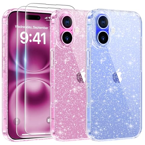 AROYI 3-i-1 genomskinligt glitterfodral kompatibelt med iP 16 Plus fodral med 2 härdat glas skärmskydd, mjuk stötfångare repfri gnistra bling kvinnor flickor telefonfodral för iP 16 Plus 6,7 tum